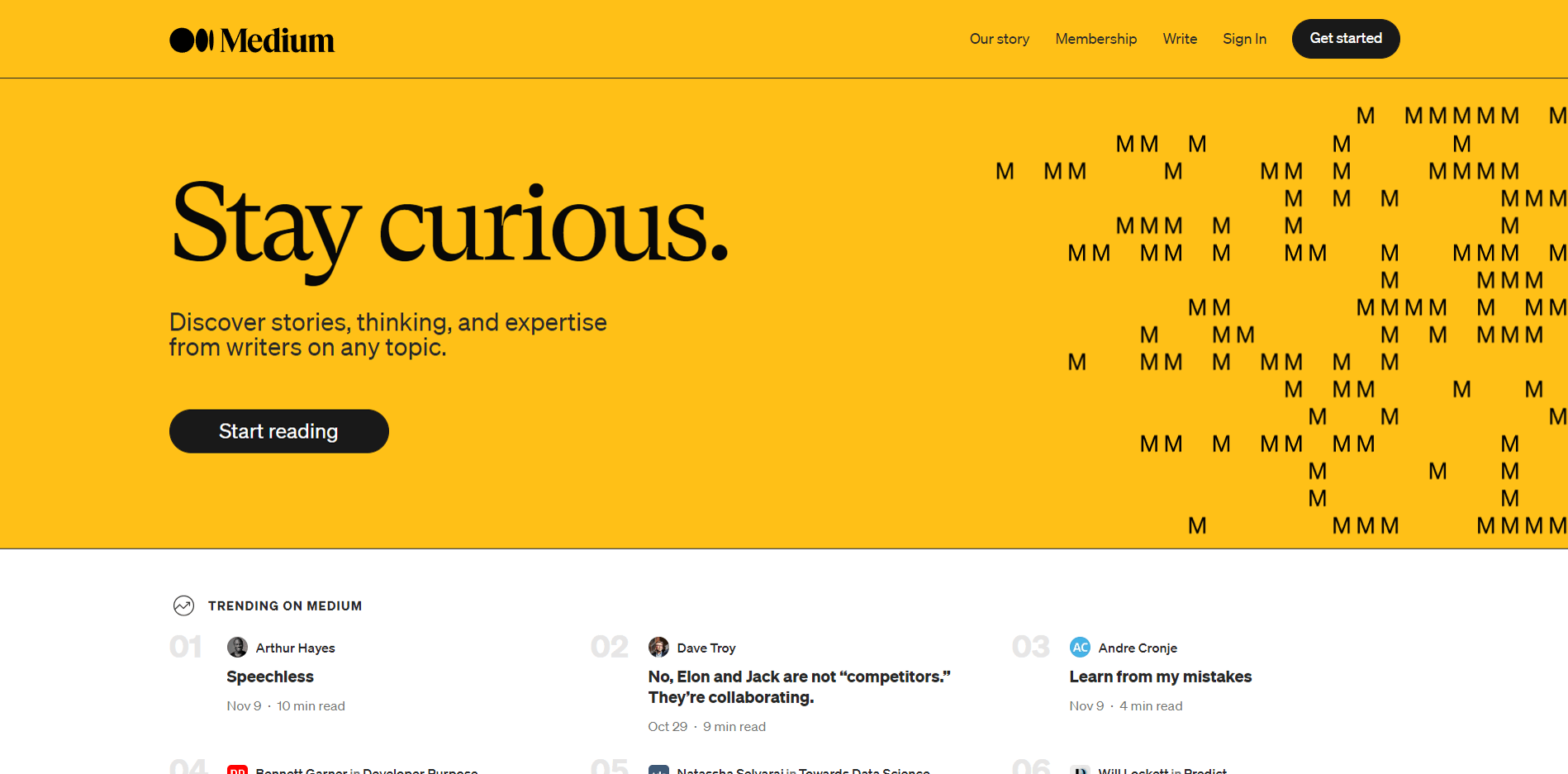 Medium — это социальное медиа для публикации текстового контента, открытое для всех. Оно стало домом для самых разных историй, идей и точек зрения. Каждый может стать автором, а популярные темы на Medium варьируются от психического здоровья до мировых событий и актуальных новостей.